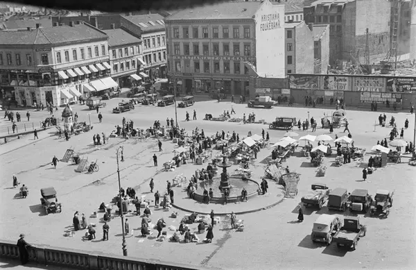 torg, mennesker, torgboder, torghandel, biler, fontene, forretningsgårder, rivningstomt