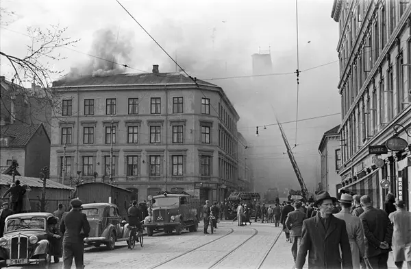 gateløp, bygårder, brann, røyk, brannbiler, stigebil, mennesker, trikkeskinner