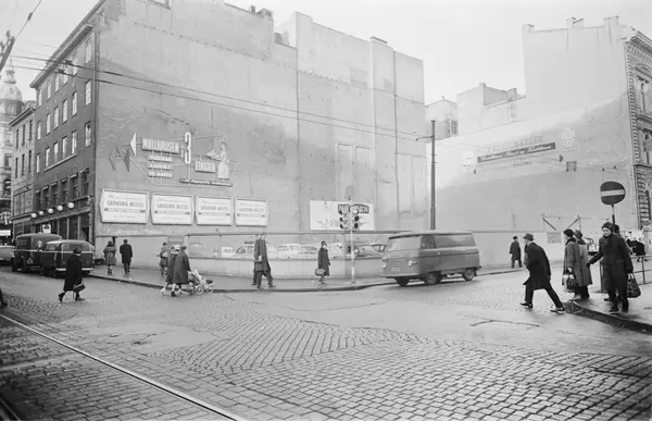 gatekryss, mennesker, biler, gateliv, rivningstomt, forretningsgårder, brostein, trikkeskinner, trolleybussledning