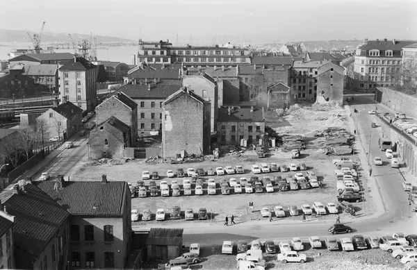 utsikt, gateløp, bygårder, bakgårder, rivningsgårder, byggetomt, parkeringsplass, biler, Akers Mek. verksted, Ruseløkkbasarene