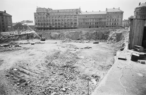 rivningstomt, byggetomt, anleggsmaskin, kran, bil, plankegjerde, anleggsbrakker, bygårder, kontorbygning, Akers mek. Verksted
