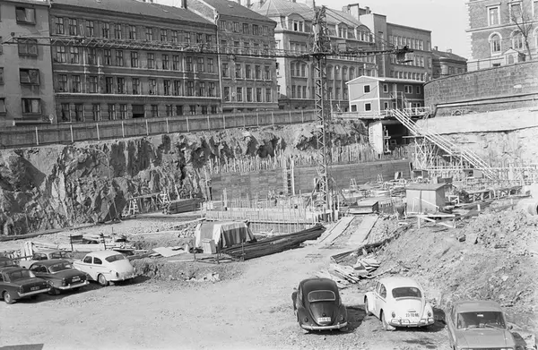 byggetomt, byggevirksomhet, plankegjerde, anleggsbrakke, trapp, forskalinger, bygårder, Statens lærerskole i forming, Oslo tekniske skole