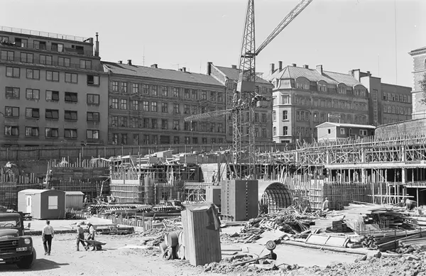 byggetomt, byggevirksomhet, plankegjerde, anleggsbrakke, forskalinger, bygårder, kontorbygning, Statens lærerskole i forming