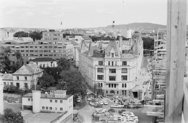 Norske Folks kontorbygg, stillas, utsikt, Ruseløkka skole, Victoria terrasse, Ingeniørenes Hus, villaer, Slottet