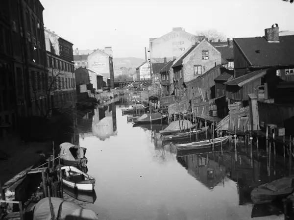 elv, trehusbebyggelse, bygårder, robåter, bro