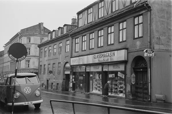 gateløp, bygårder, forretningsgårder, Nollik Nilsen glasmagasin, kvinne, port, bil