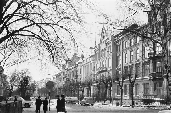 gateløp, bygårder, forhager, biler, mennesker, snø