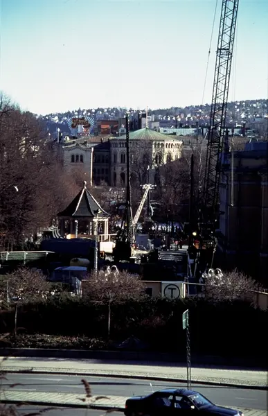 utsikt, park, anleggsarbeid, kran, Nationaltheatret T-banestasjon, Nationaltheatret, musikkpaviljong, Stortingsbygningen