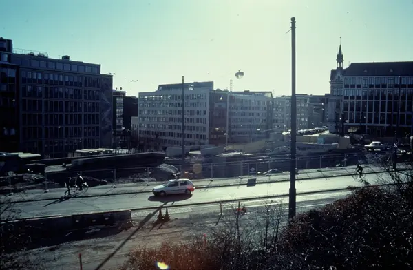 bygging av nye Nationaltheatret jernbanestasjon, anleggsarbeid, kontorbygninger, vei, biler, syklister