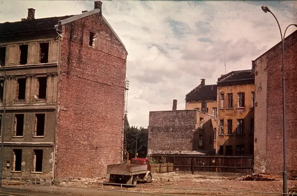 bygårder, rivningsgård, gavlvegg, rivningstomt, Commer lastebil, gatebelysning