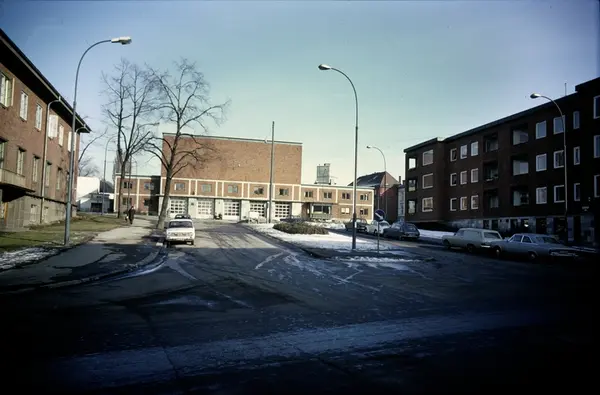 gateløp, midtrabatt, gatebelysning, biler, Briskeby brannstasjon, boligblokk