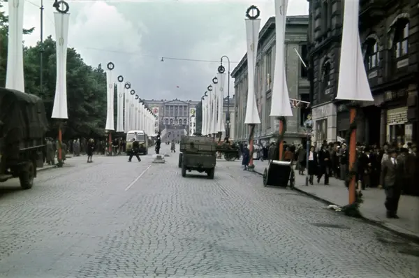 gateløp, forretningsgård, Universitetet, mennesker, trafikkonstabel, pynt, bannere, kongemonogrammer, militære kjøretøyer, buss, Slottet