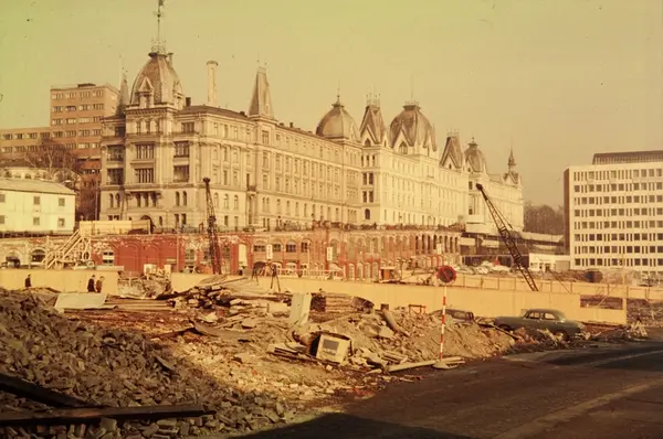 Victoria terrasse, Ruseløkkbasarene, rivningsarbeid, Vikaterrassen, kontorbygninger, Storebrand forsikring, Konserthustomten, biler, Arbins løkke, Ingeniørenes Hus