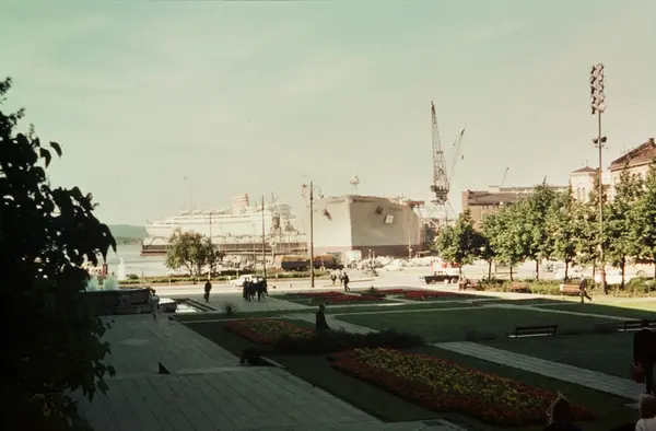 park, blomsterbed, fontene, mennesker, trafikk, havn, Akers mek. Verksted, skip, kraner, Kielfergen, Vestbanestasjonen