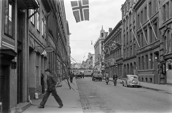 Skippergata pyntet til kongens hjemkomst, 1945.