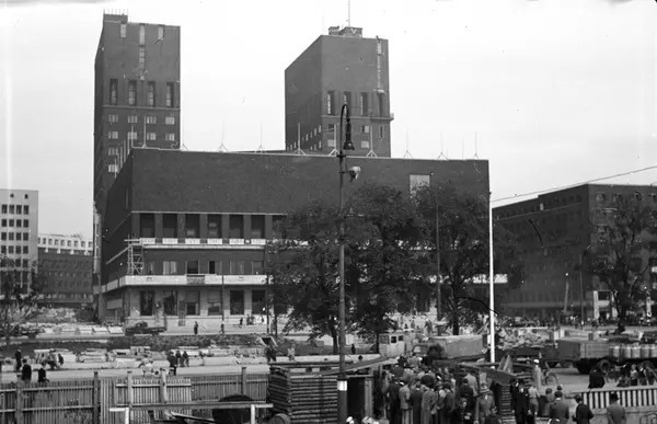 Rådhusplassen klargjøres til kongens hjemkomst, mennesker, biler, Rådhuset, kontorbygninger