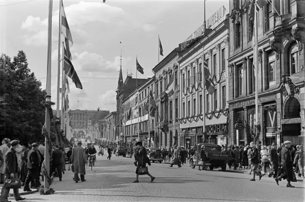 Karl Johans gate pyntet til kongens hjemkomst, 1945.