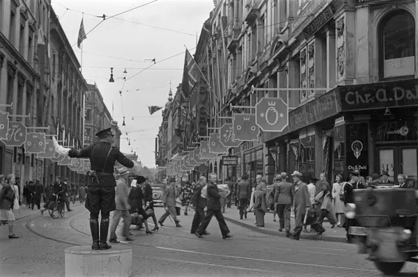 gateløp, mennesker, gateliv, trafikkonstabel, biler, forretningsgårder, flagg, kongemonogram