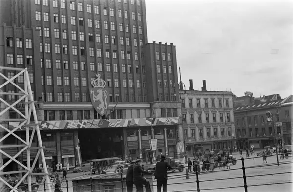 Folketeaterbygningen pyntet til kongens hjemkomst, 1945.