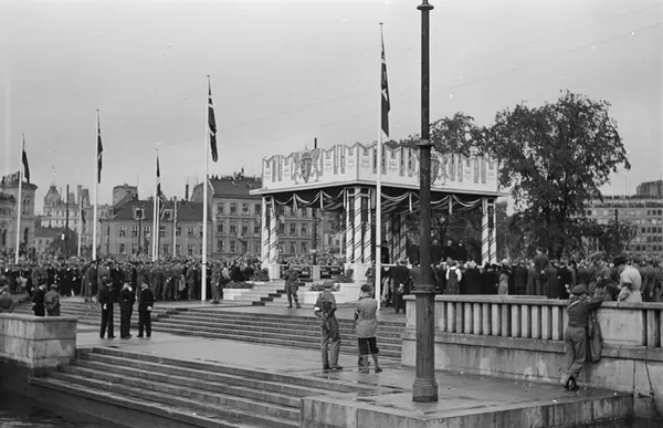 Rådhusbryggene ved kongens hjemkomst, 1945.