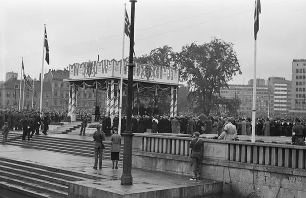 Rådhusbryggene ved kongens hjemkomst, 1945.