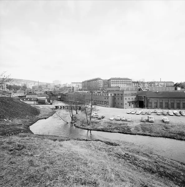 elv, Myrens verksted, fabrikkbygninger, parkeringsplass, biler, bro, boligblokker, bygårder