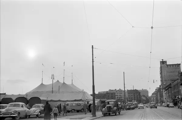 gateløp, biler, mennesker, bygårder, forretningsgårder, torg, sirkustelt