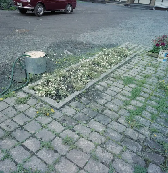 Frogner Hovedgård, gårdsplass, blomsterbed, brostein