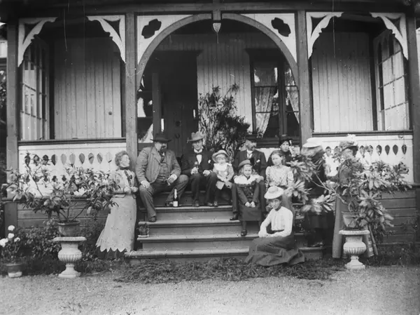 Fra venstre: Constance Sparre, Christen Sandberg, Harald Nørregaard, Hans Jacob Nørregaard, Christian Sparre, Aadel Nørregaard, Ebba Sparre, Eva Sanberg.