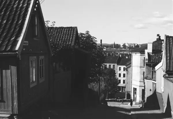 gateløp, trehusbebyggelse, bygårder, mennesker, utsikt