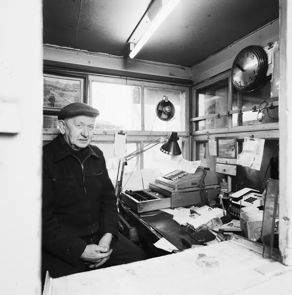 Rolf Johannesen, eier av det siste brenselutsalg av den gamle sorten på Grünerløkka. På bildet sitter han i det han selv kaller for "kontorboksen".