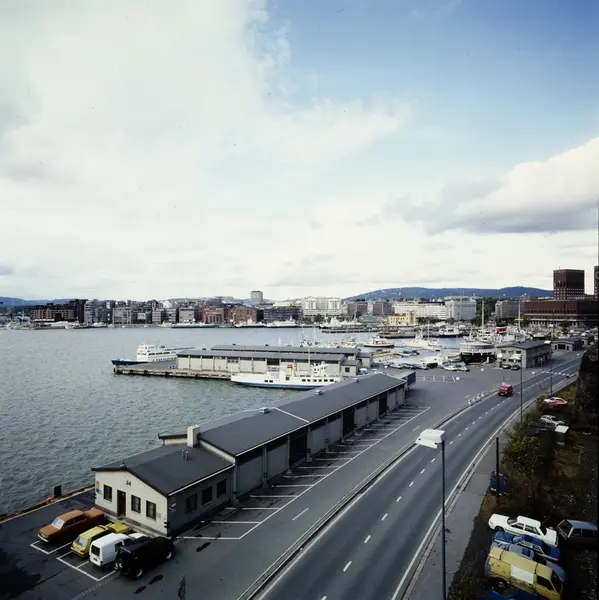 utsikt, havn, båter, havneskur, vei, biler, Rådhuset, Vestbanestasjonen, Aker Brygge