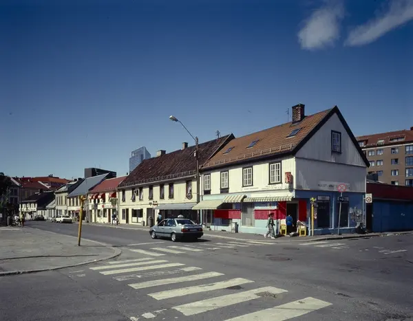 gateløp, fotgjengerovergang, trehusbebyggelse, forretninger, biler, mennesker
