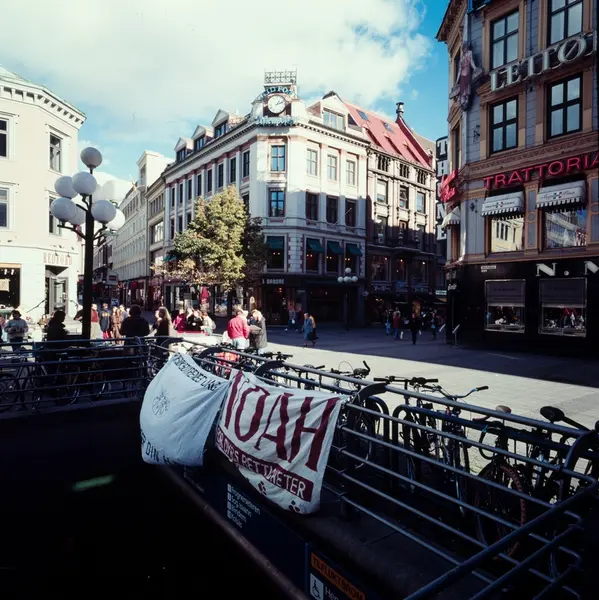 gateløp, forretningsgårder, gateliv, mennesker, sykler, nedgang til Stortinget T-banestasjon