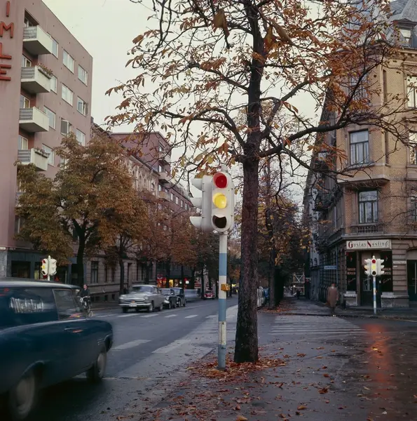 gateløp, bygårder, biler, trafikklys, regnvær, løvfall, høst