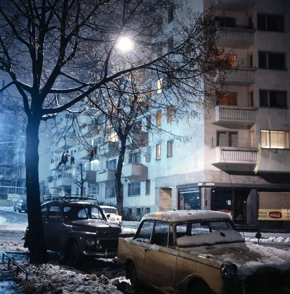 bygård, forretninger, biler, tre, snø, gatebelysning