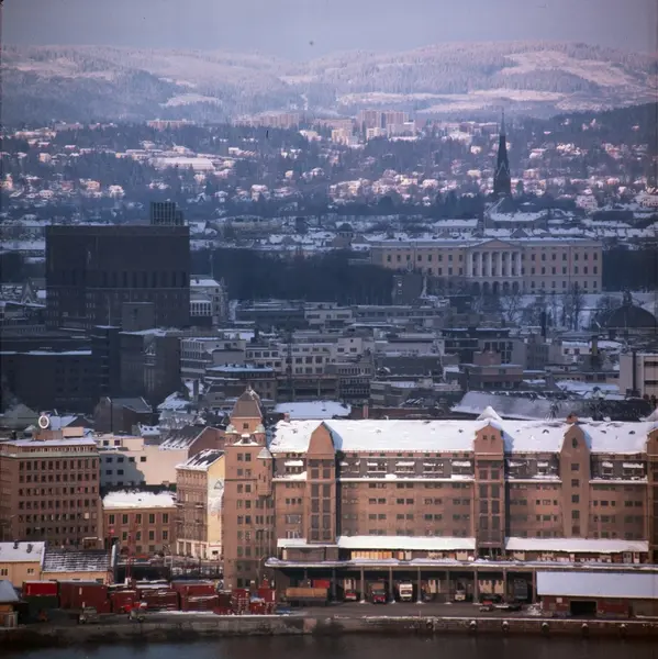 utsikt, havn, Oslo Havnelager, Rådhuset, forretningsgårder, Slottet, Uranienborg kirke, villabebyggelse, blokkbebyggelse, skog, åser, snø