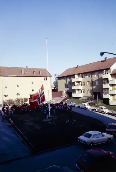 boligblokker, hage, 17. mai-feiring, flaggheising, Karlsrud skoles musikkorps, biler