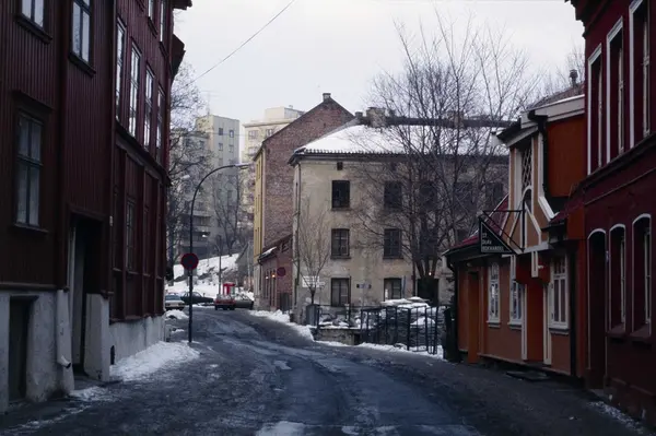 gateløp, bygårder, trehusbebyggelse, mennesker, snø