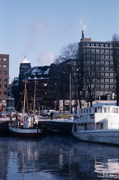 havn, fiskeskøyter, Barodd, kontorbygninger, portrettsatue, mennesker, biler, snø