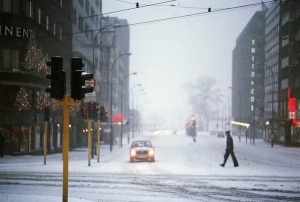 gateløp, kontorbygninger, forretningsgårder, bil, mennesker, juletrær, snø