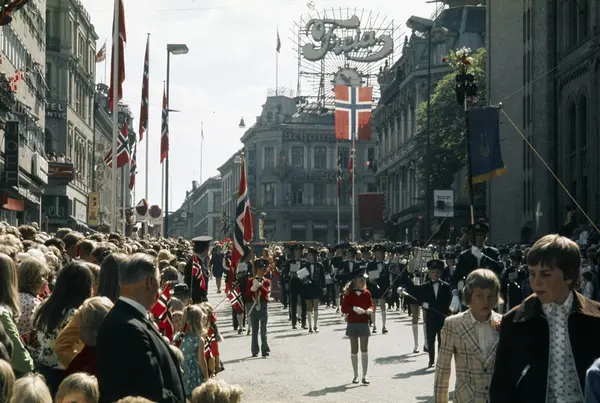 17. mai-tog, musikkorps, fane, flagg, publikum, Stortingsbygningen, forretningsgårder, lysreklame, Freia-uret