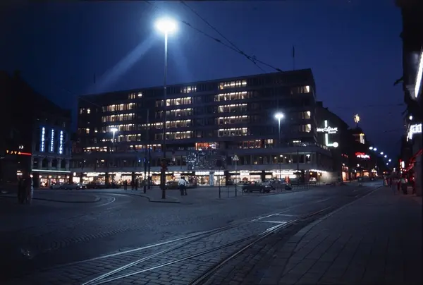 torg, gateløp, kontorbygning, Kreditkassen, forretningsgårder, gatebelysning, biler, mennesker, nattemørke
