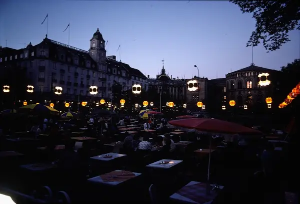 friluftsrestaurant, småbord, mennesker, gjester, lykter, Grand Hotel, Stortingsbygningen, forretningsgård