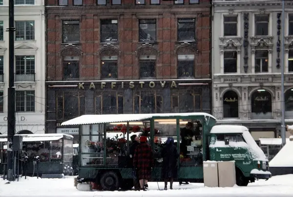 torg, blomsterbil, blomstersalg, kvinner, menn, forretningsgårder, snø