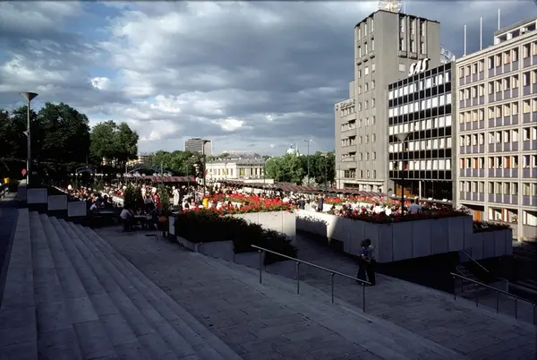 Kongeterrassen friluftsrestaurant, mennesker, trapp, kontorbygninger