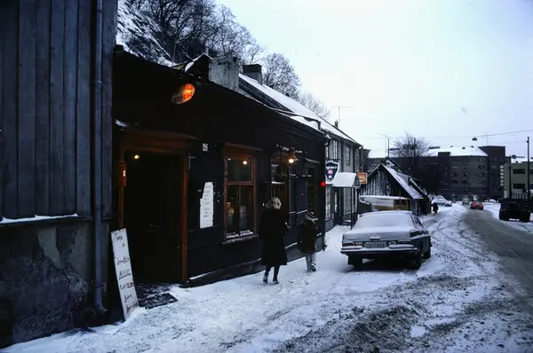 gateløp, trehusbebyggelse, restaurantskilt, mennesker, boligblokker, snø