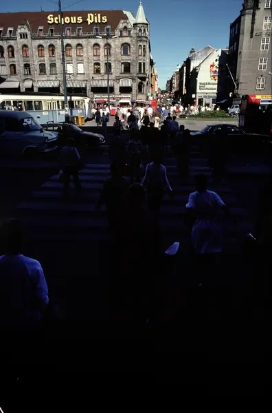 utsikt, torg, fotgjengerovergang, mennesker, biler, trikk, forretningsgårder