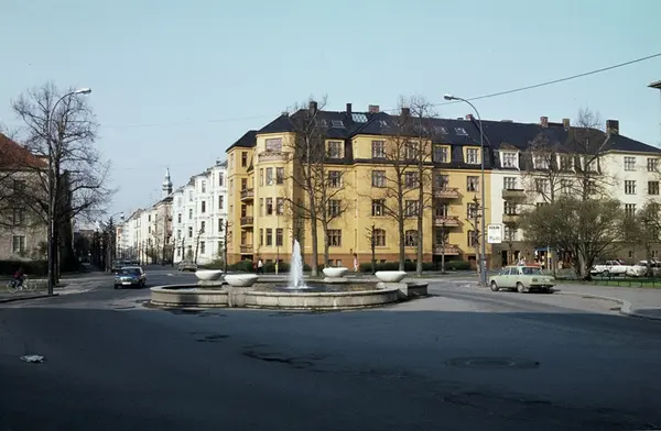 plass, gatekryss, basseng, fontene, biler, bygårder