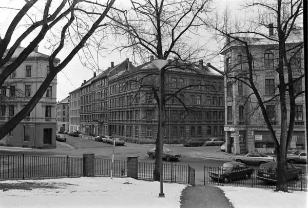 parken rundt Sofienberg kirke, gjerde, port, gatekryss, bygårder, biler